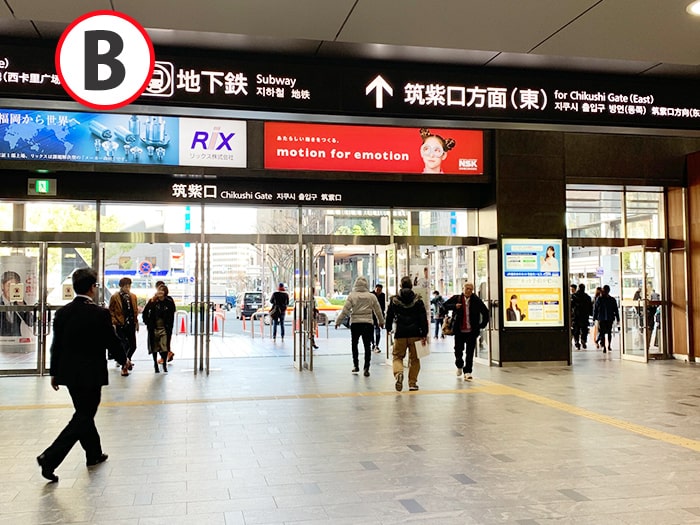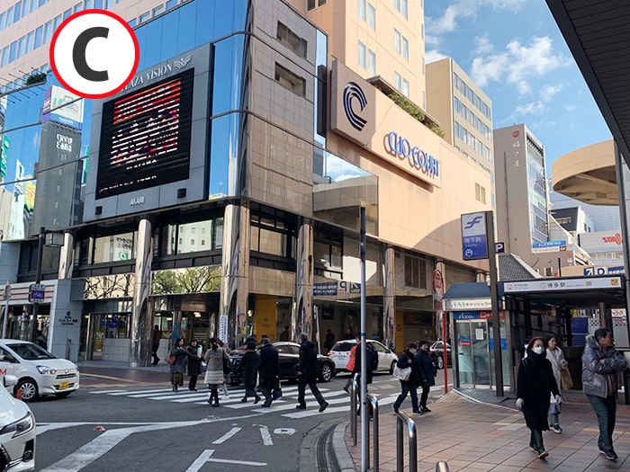 「筑紫口」を出ると右手に大きなビジョンが見えます。(ホテルクリオコート博多)