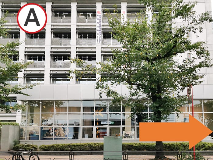 入谷口を出ると正面に岩倉高等学校が見えます。そのまま右側に直進してください。