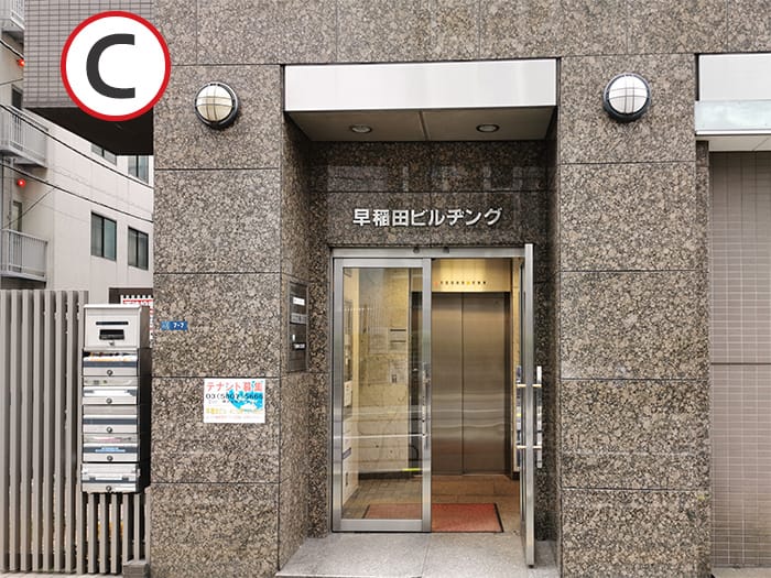 信号を渡りファミリーマートの右側の道を直進すると早稲田ビルヂングの入口がありますのでそこから3Fへお越しください。