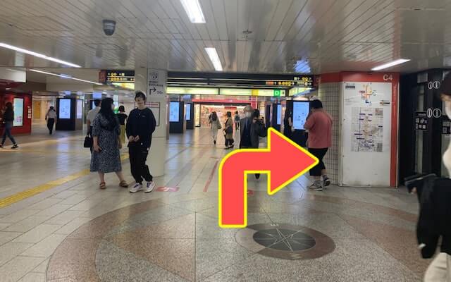 右手の地下鉄の改札を通り過ぎ、右手に曲がり12番出口を目指します。