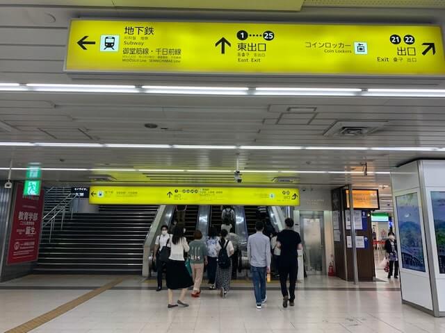 東改札を出ると、目の前にエスカレーターがあるので、エスカレーターを上ります。