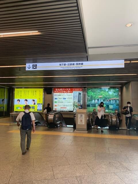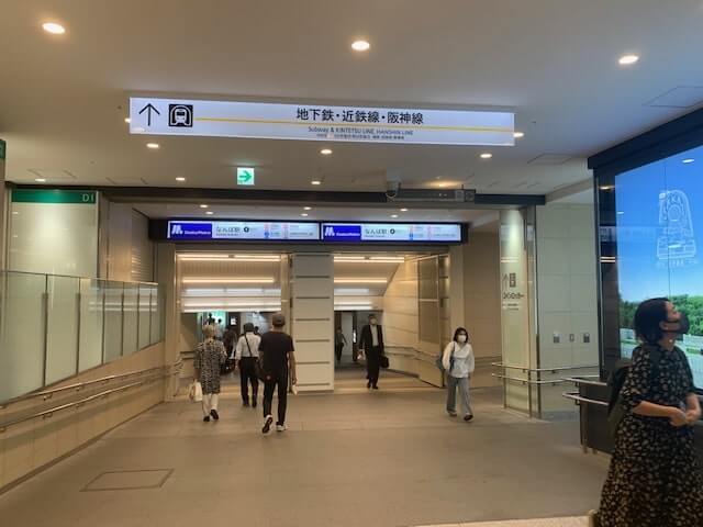 地下鉄に通じる通路に入ります。御堂筋の改札やマルイを通り過ぎ、12番出口を目指します。